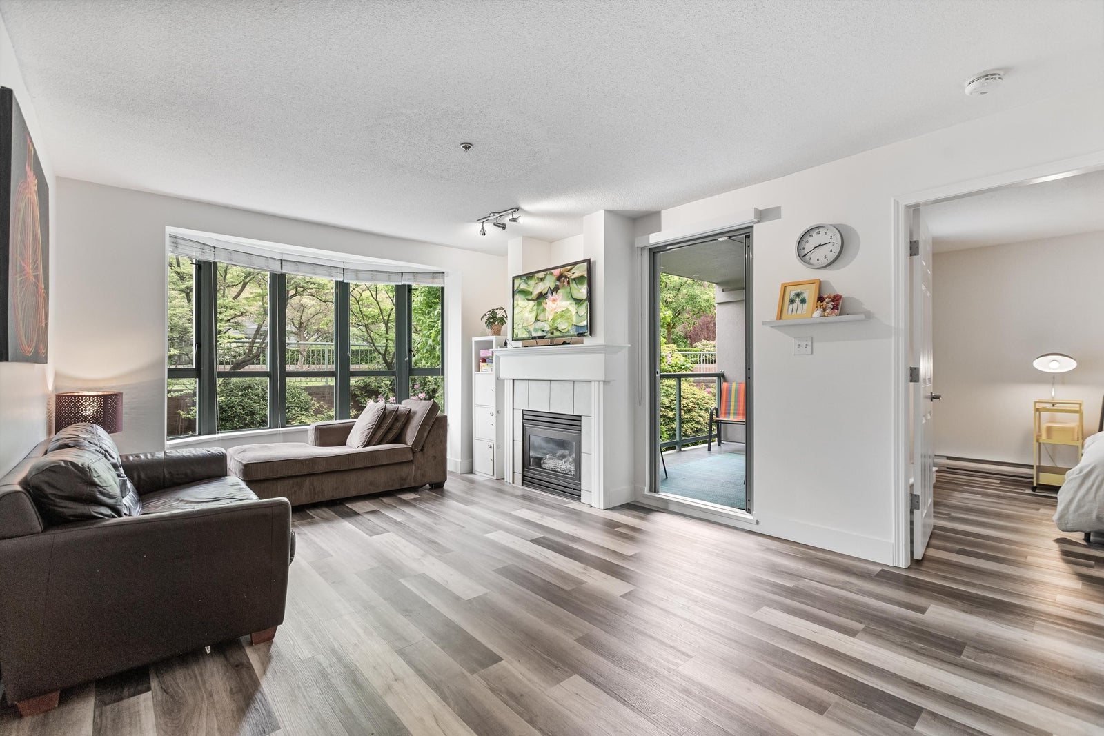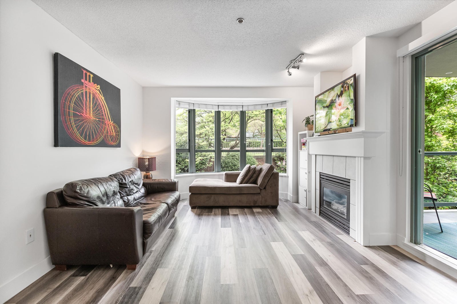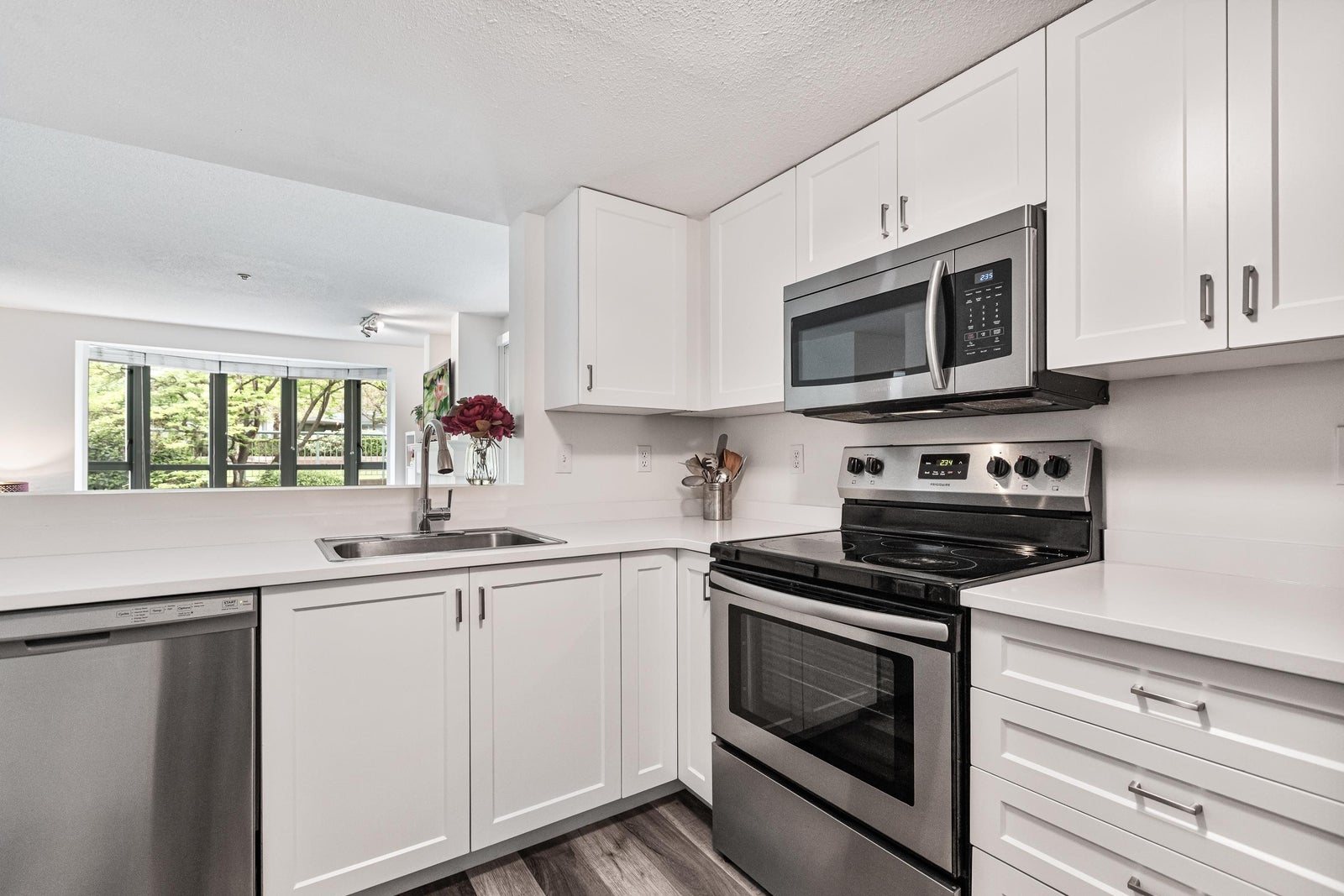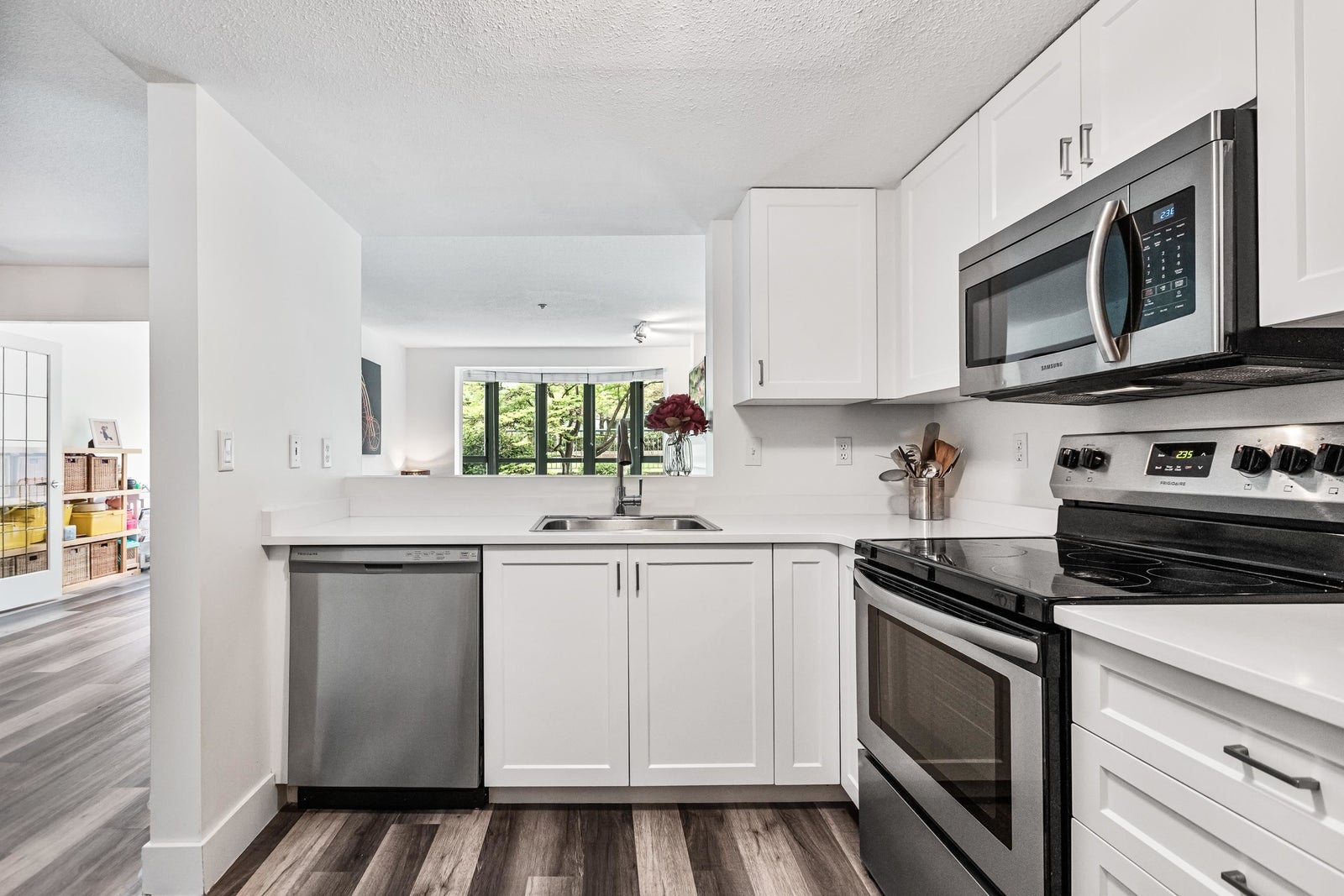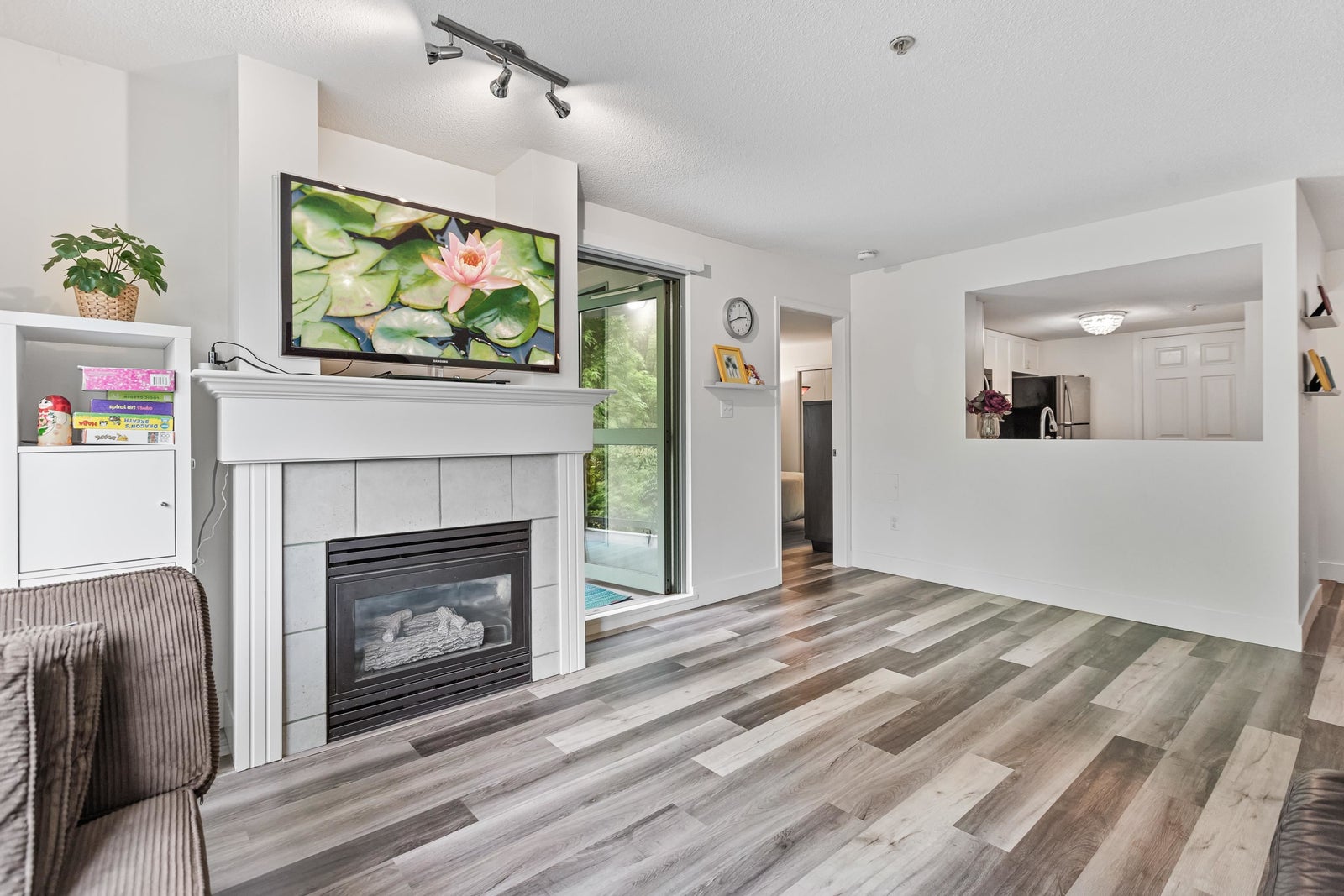 Renovated 2 bed, 2 bath condo in the Burrard Building at Newport Village. Quiet, private, surrounded by lushes greenery & move-in ready. Kitchen has been updated with new white shaker cabinets, quartz counters, stainless steel appliances & a large pantry & pass through creating a more open concept space. This well cared for unit has also been refreshed with wide plank laminate, updated light fixtures & blinds throughout. It also comes with a gas fireplace, perfect to warm up those rainy days. Second bedroom is a great versatile space, that can be used as a bedroom, office or playroom. Large, private patio is ready for your summer BBQs or morning coffees surrounded by trees. Unbeatable location - steps to SkyTrain, West Coast Express, shops, dining & more.